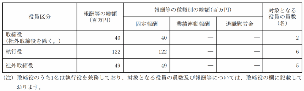 取締役の報酬は2名で40百万円、執行役の報酬は6名で122百万円となっています。また、パワーエックスは指名委員会等設置会社であるため、社外取締役が5名存在しており、報酬は49百万円となっています。一般的な社外監査役(スタートアップ)の報酬だと10百万円を超えることがほとんどないことを考えると報酬は高め(ただし、監督責任は多い)ということになろうかと思います。