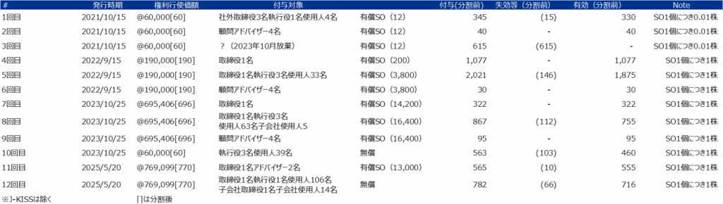 初回はJ-Kissによる初めての資金調達のタイミングで発行しています(1~3回新株予約権)。初期的に関与してもらった社員、役員、アドバイザーに対して発行しており、株式に準じた内容で発行されています。なお、3回の発行先は不明ですが、おそらく離脱によってすべての権利が執行しています。