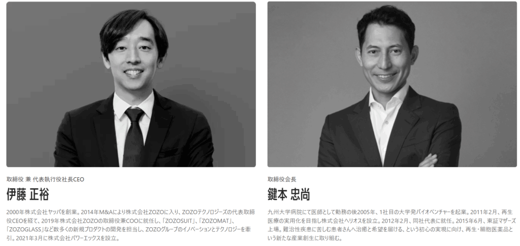 伊藤代表執行役(伊藤ハム創業者のご令孫)は学生時代に起業した会社をZOZOに売却し、その後、ZOZOグループでで様々なプロダクト開発に関与。また、鍵本取締役会長は創薬ベンチャーを上場後、様々な会社の起業に関与。それ以外の社外取締役も経営経験が豊富なメンバーを会社設立段階から巻き込んでおり、シリアルアントレプレナーが起業しているケースとなります。