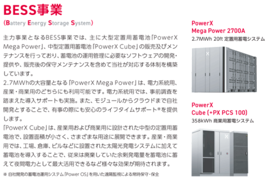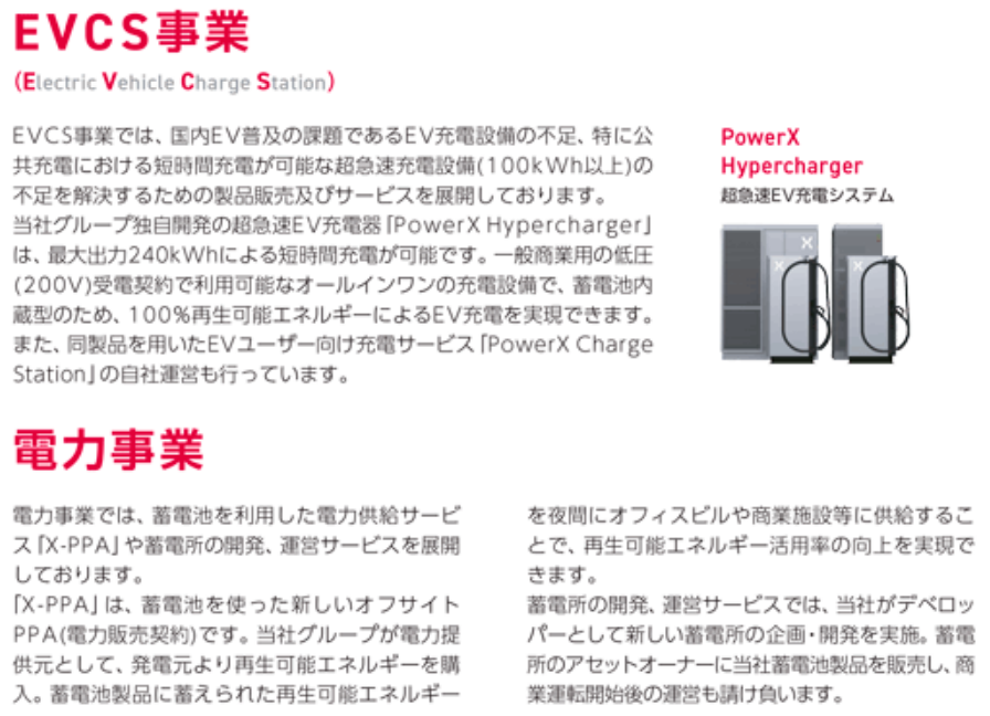 パワーエックスの事業はBESS事業(大型蓄電池販売事業)、EVCS(EV充電設備販売事業)、電力事業となっています。