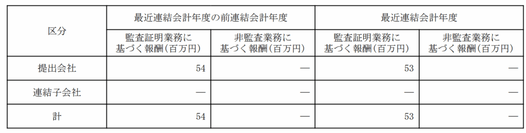 監査報酬は最近事業年度の前事業年度が54百万円、最近事業年度が53百万円と、比較的支払額が多くなっています。