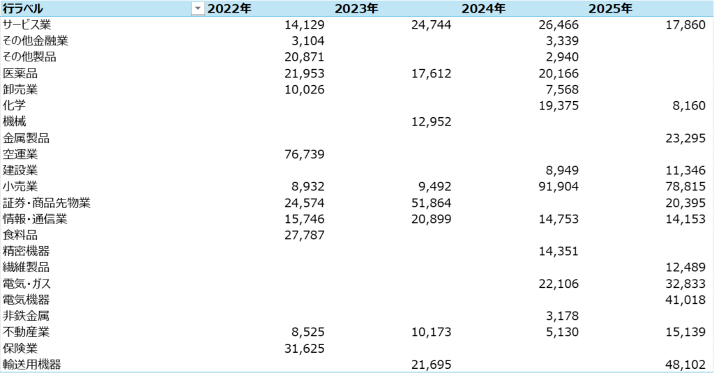 業種別の時価総額の平均値は上記の通りです。