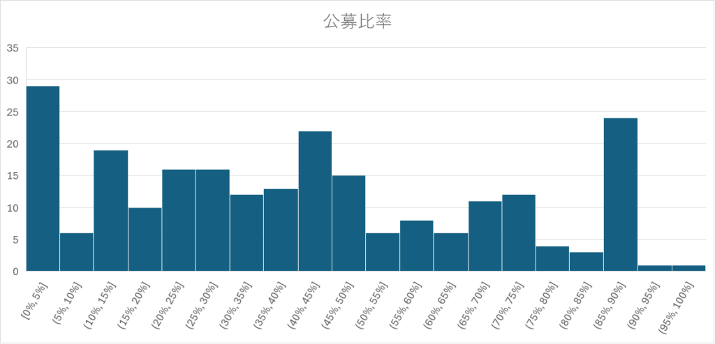 公募比率は①0%(資金調達目的ではないIPO)、②80%強(資金調達が主目的のIPO)、③50%(①と②の中間)の3つの山が存在するようです。また、25%や75%等は切りの良い数字として決められているのではないかと想像します。