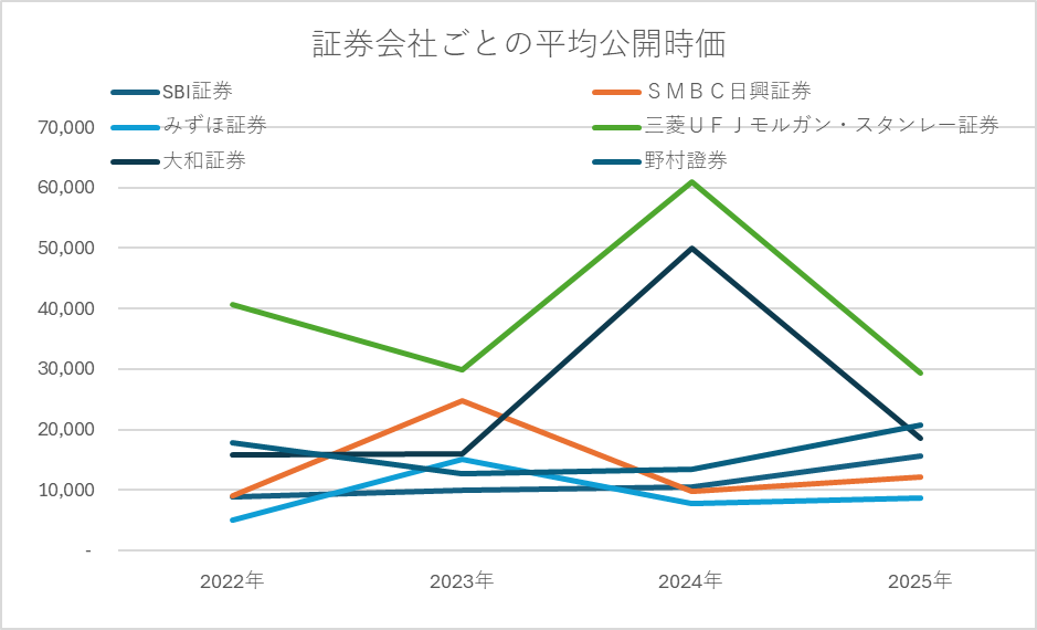 しかしながら、大きな変動がある三菱UFJモルガンスタンレーや大和証券は大型案件(トライアルなど)の影響で上下しているのみ、それ以外の証券会社は2024年から比べるとやや上昇しているものの、2023年以前と比べて大きく変動していないように見えます。(2025年は小規模案件を絞った結果多少は上昇する方向にはなったと考えられます)